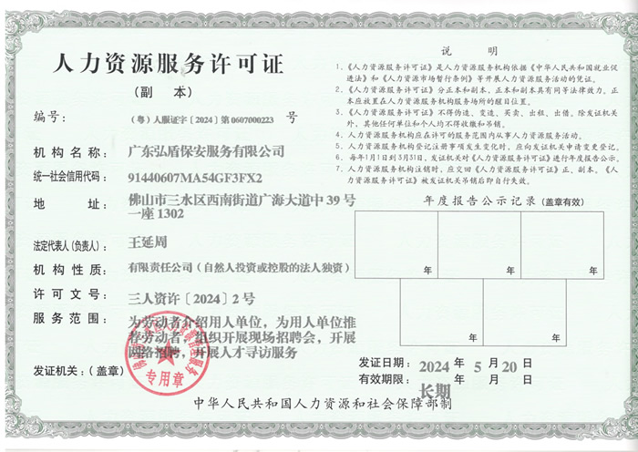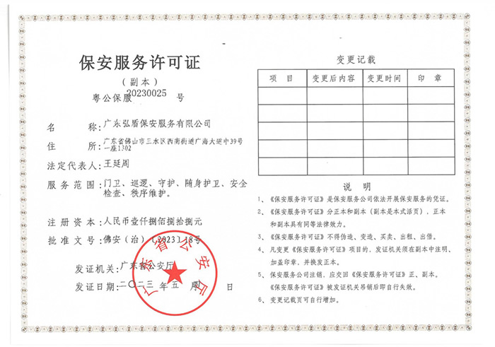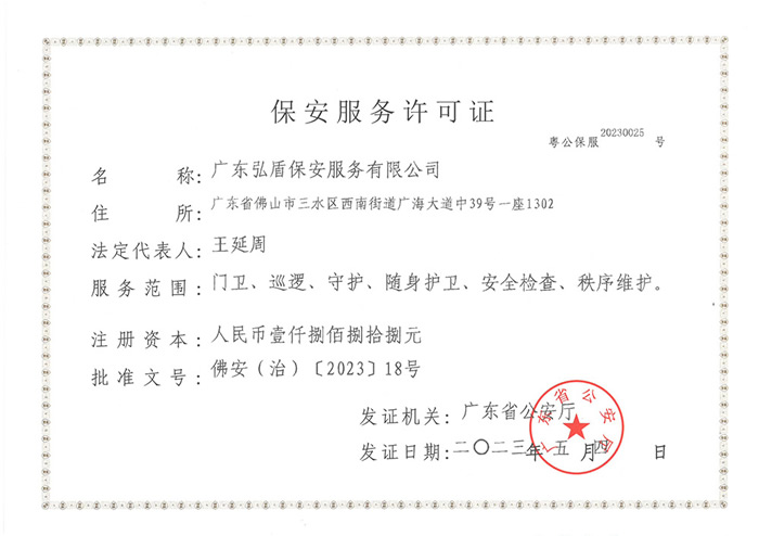 - 廣東弘盾保安服務有限公司東莞分公司是經東莞市公安局嚴格審核,廣東省公安廳批準頒發《保安服務許可證》,在東莞市工商行政管理機關登記注冊的,依法開展門衛、巡邏守護、秩序維護、隨身護衛,安全檢查等綜合安保服務的專業保安服務公司... [詳細介紹]